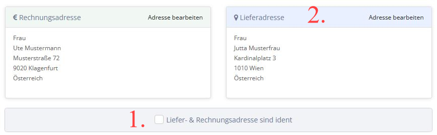 - Entfernen Sie das Häckchen bei “Liefer- & Rechnungsadresse sind ident”, direkt in der Kasse.